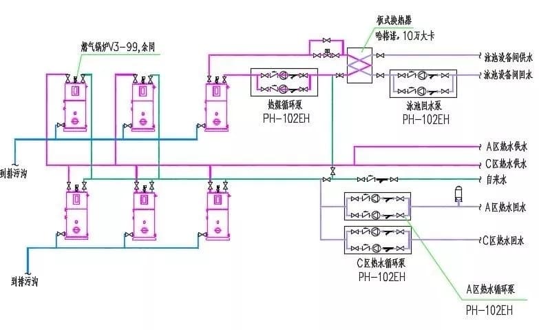 膨脹罐、軟水處理器組成。 圖1是峨眉山某溫泉酒店的熱水系統圖,鍋爐采用3臺方快CLHS0.35-95/70-YQ
