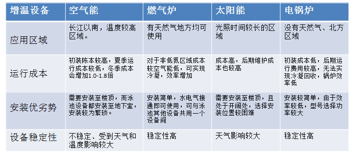 在泳池增溫系統(tǒng)中主要用到太陽(yáng)能、空氣能、商用燃?xì)忮仩t、電鍋爐四種增溫設(shè)備
